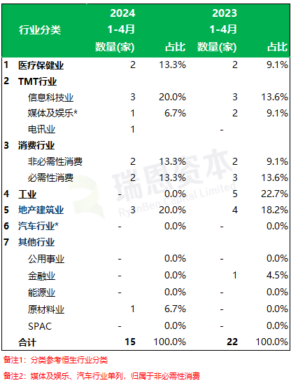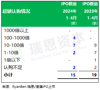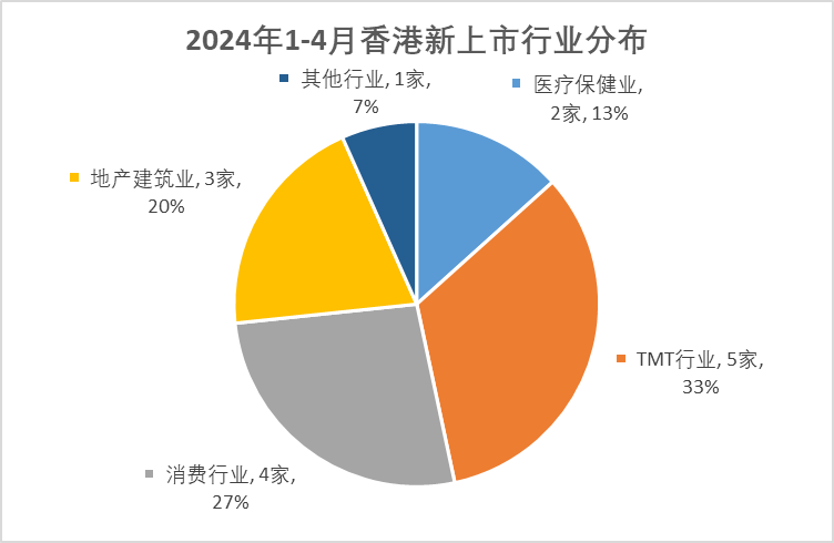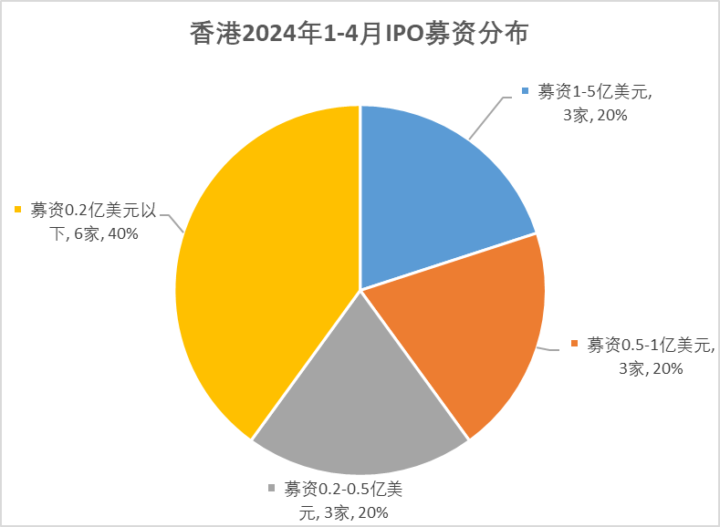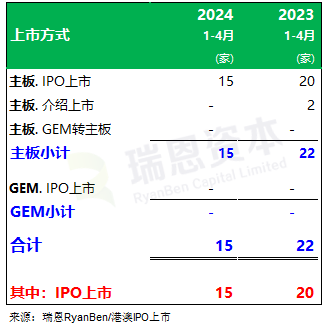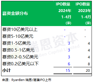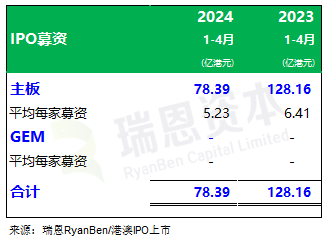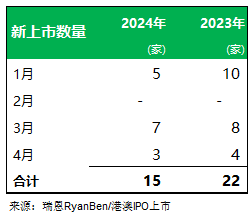 2024年前四个月香港新上市公司共 15家,募资 78.39亿(港元,以下同),新上市数量较上年同期少 7家,募资金额按年减少49.76亿或 38.83%。