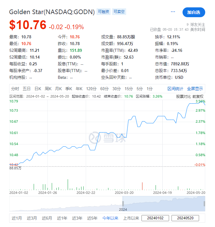 截至昨日(5月20日)收市,Golden Star(GODN)市值约7,892.88万美元。