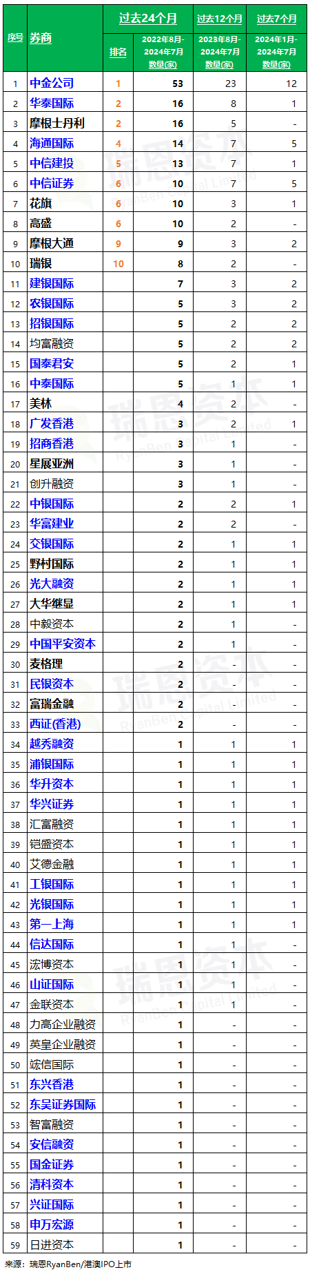 就今年前7个月的数据来看,这59间券商中的 29间,以上市保荐人、联席保荐人的身份参与40家新上市公司的保荐工作。