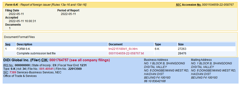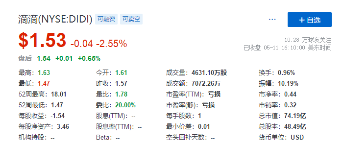 滴滴(DIDI),于2021年6月30日在美国挂牌上市,股价最高18.01美元、最低1.47美元,截至昨日(5月11日)收报每股1.53美元,较IPO发行价(每股14美元)仍低出 89.1%,目前其市值为 74.19亿美元。