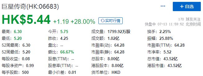 截至午间收市,巨星传奇每股报5.44港元,大涨28%,总市值约43.52亿港元。