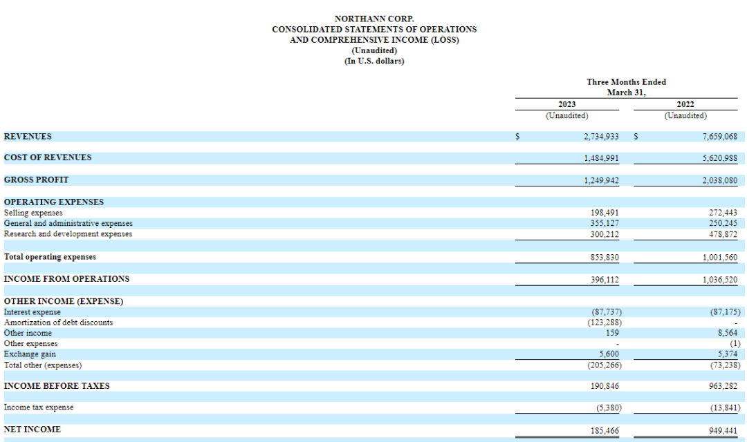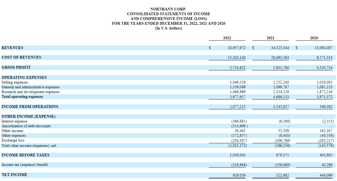招股书显示,在过去的2020年、2021年、2022年和2023年前三个月,诺森的收入分别为1,309.41万、3,452.53万、2,095.80万和273.49万美元,相应的净利润分别为44.41万、32.27万、92.91万和18.55万美元。
