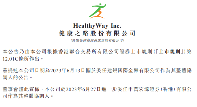2023年6月27日,健康之路股份有限公司 HealthyWay Inc. (以下简称“健康之路”)公告,进一步委任申万宏源证券(香港)有限公司为整体协调人。