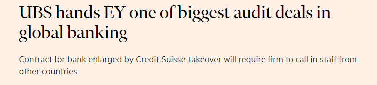 据金融时报引述消息人士称,瑞银(UBS)将续聘安永(EY)为独立核数师,并且由2024年起,扩大其审计范围将包括瑞信(Credit Suisse)的账目,原先担任瑞信审计工作的普华永道(PwC),将完成对瑞信今年的审计工作。