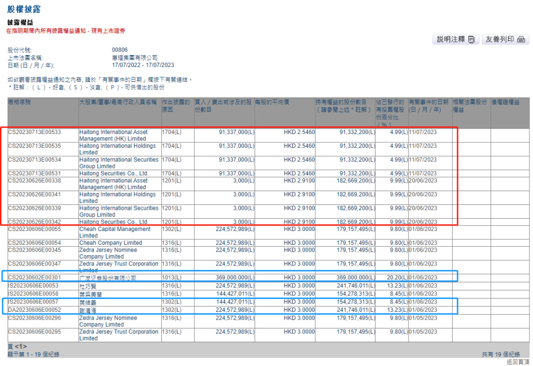 惠理集团(00806.HK)继两大股东谢清海、叶维义计划出售手上两成股权予中资证券公司广发证券(01776.HK)后,另一主要股东海通证券(06837.HK) 上周二(7月11日)出售惠理集团约9133.70万股,每股平均价2.546港元,套现2.33亿港元,持股量由9.99%降至4.99%,由于交易后持股量低过5%的必须披露门槛,日后海通证券无须对外公布沽出惠理集团股份。