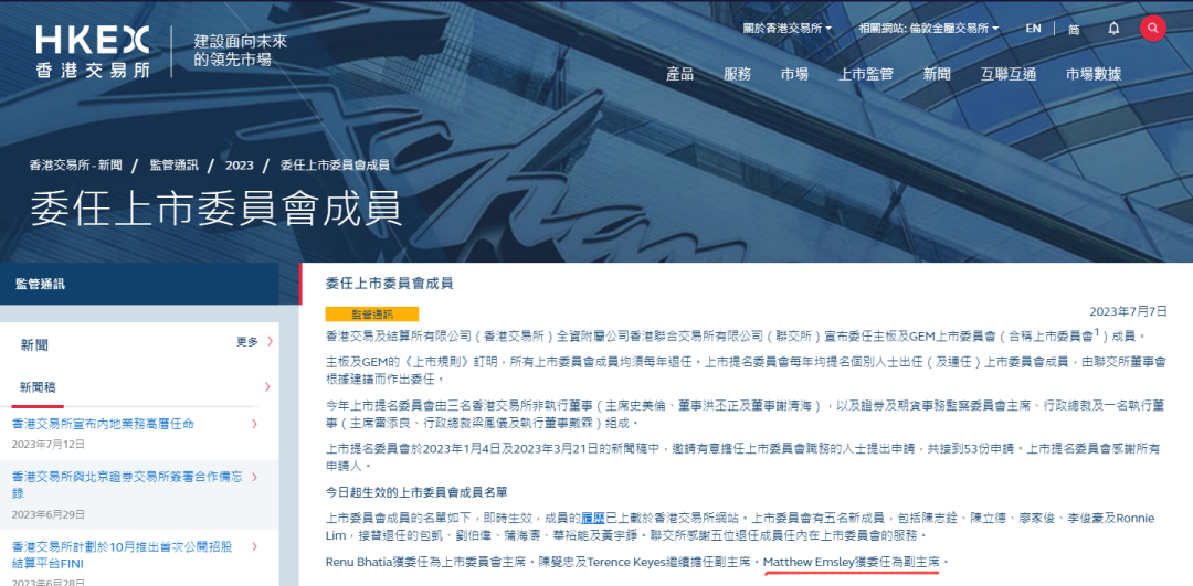 港交所旗下联交所于7月7日公布,2023年主板及GEM上市委员会(合称上市委员会)成员,实时生效。