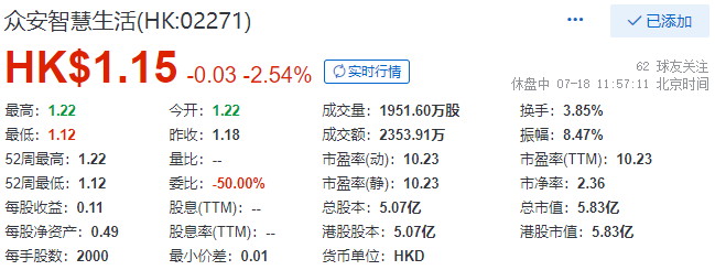 截至午间收市,众安智慧生活每股报1.15港元,跌2.54%,总市值约5.83亿港元。