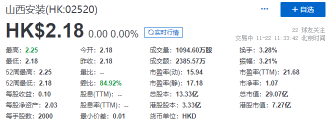 截至午间收市,山西安装每股报2.18港元,不涨不跌,总市值约29.07亿港元。