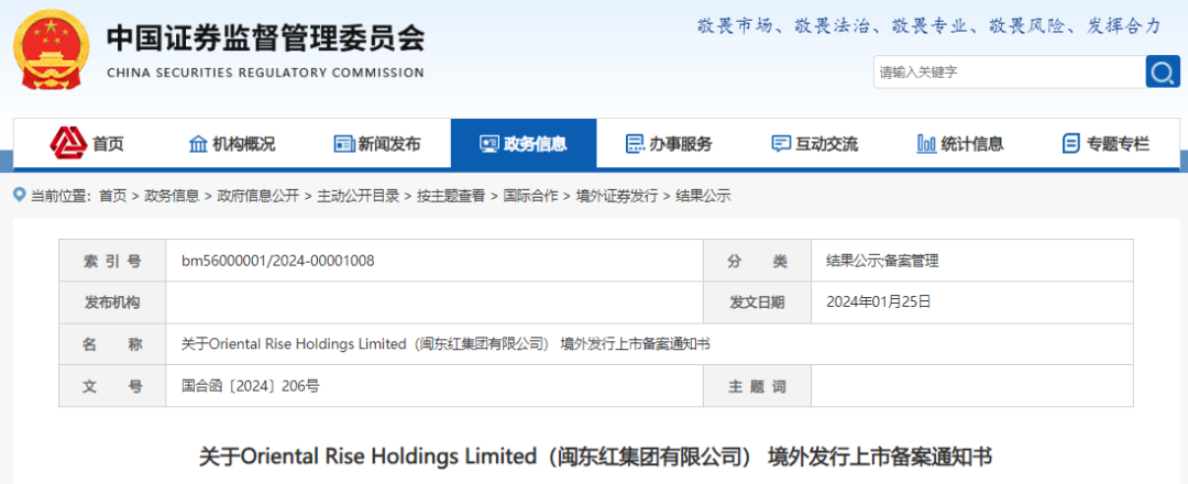 12月21日,中国证监会国际合作部发布关于Oriental Rise Holdings Limited(闽东红集团有限公司) 境外发行上市备案通知书(国合函〔2024〕206号)。根据中国证监会发布的境外上市备案情况表,闽东红茶叶的申报类型为间接境外上市,备案申报主体为福建闽东红茶业科技有限公司,备案接收日期为2023年11月2日。US Tiger Securities为其承销商,竞天公诚为其境内律师。