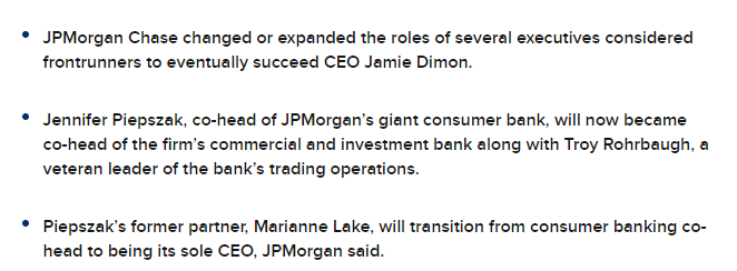 摩根大通,于周四(1月25日)宣布对一些关键管理人员增加新的职责,这些职责将在公司的成功基础上继续发展,并继续为公司的未来定位。